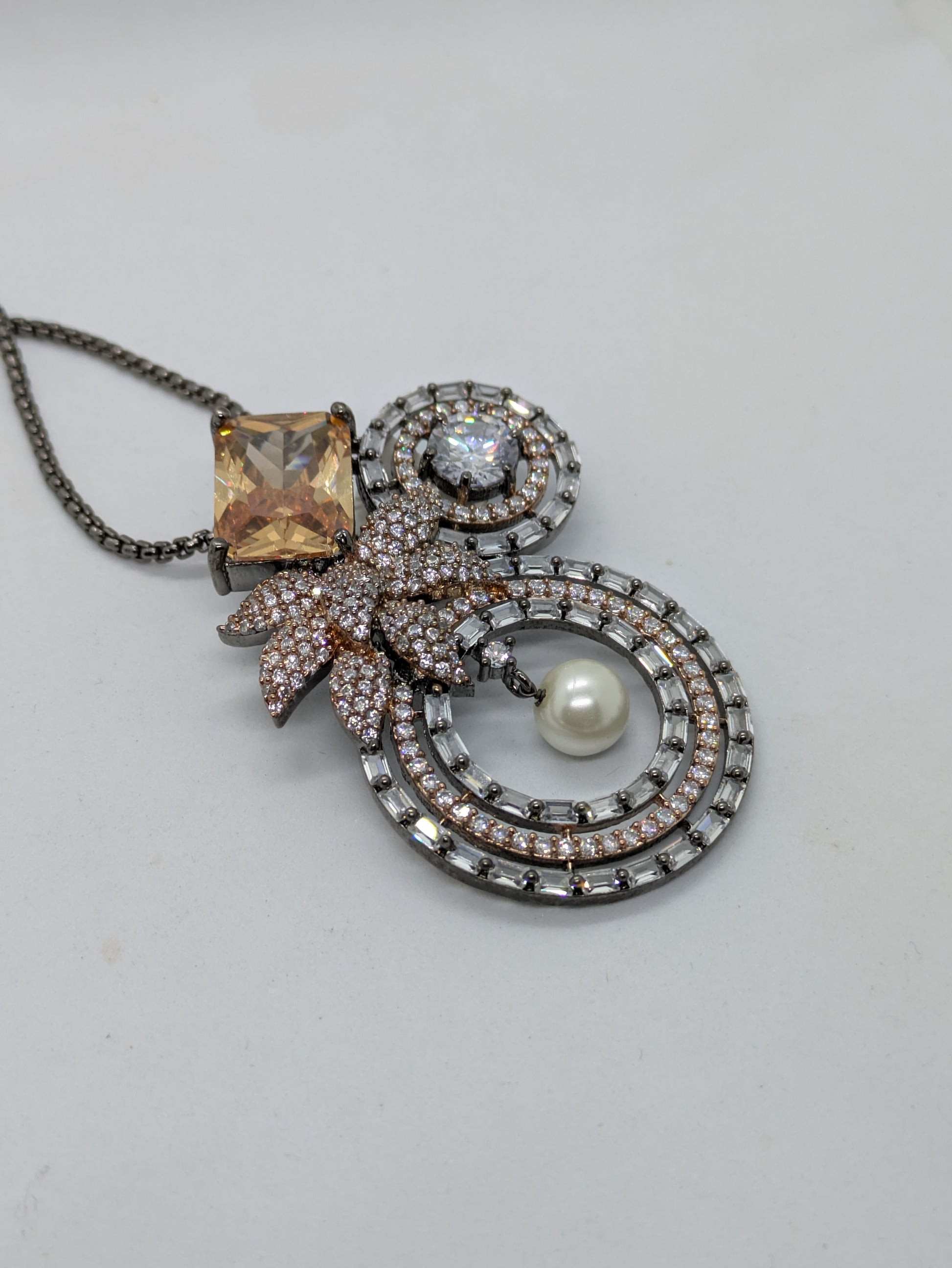 The Amber Bloom Pendant Set is a striking blend of artistry and elegance. Featuring a radiant amber-hued gemstone, crystal-studded floral motifs, concentric circular accents, and a delicate pearl drop, this pendant with matching earrings is designed to turn heads. A luxurious fusion of modern glamour and timeless grace — perfect for weddings, festive evenings, or statement dressing.