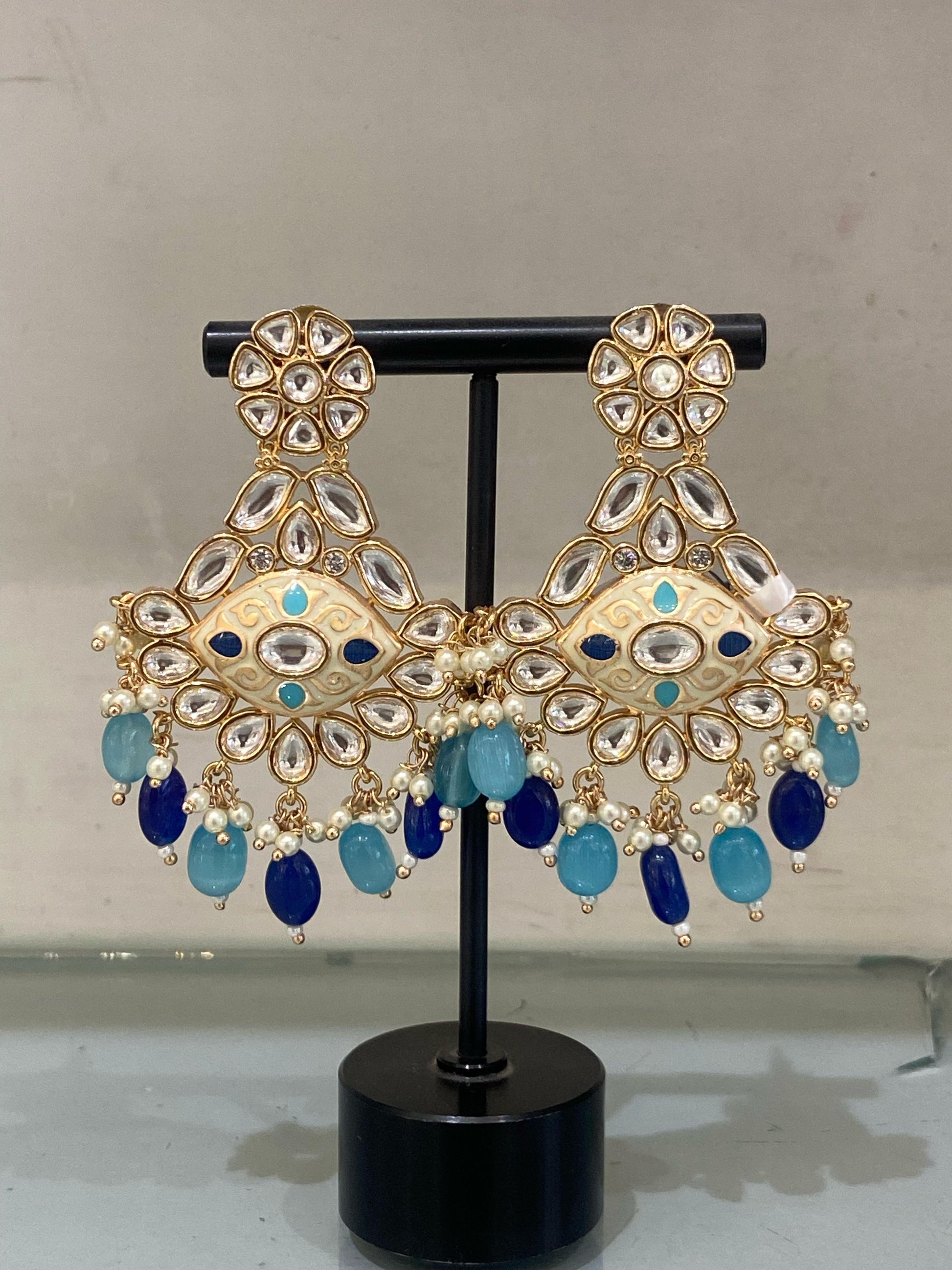 Make an unforgettable entrance with these breathtaking chandbaali-style earrings, featuring a lavish mix of aqua and navy blue bead drops. Surrounded by kundan-style stones and delicate pearl accents, these earrings are designed to enhance bridal, festive, or statement outfits with a royal touch.